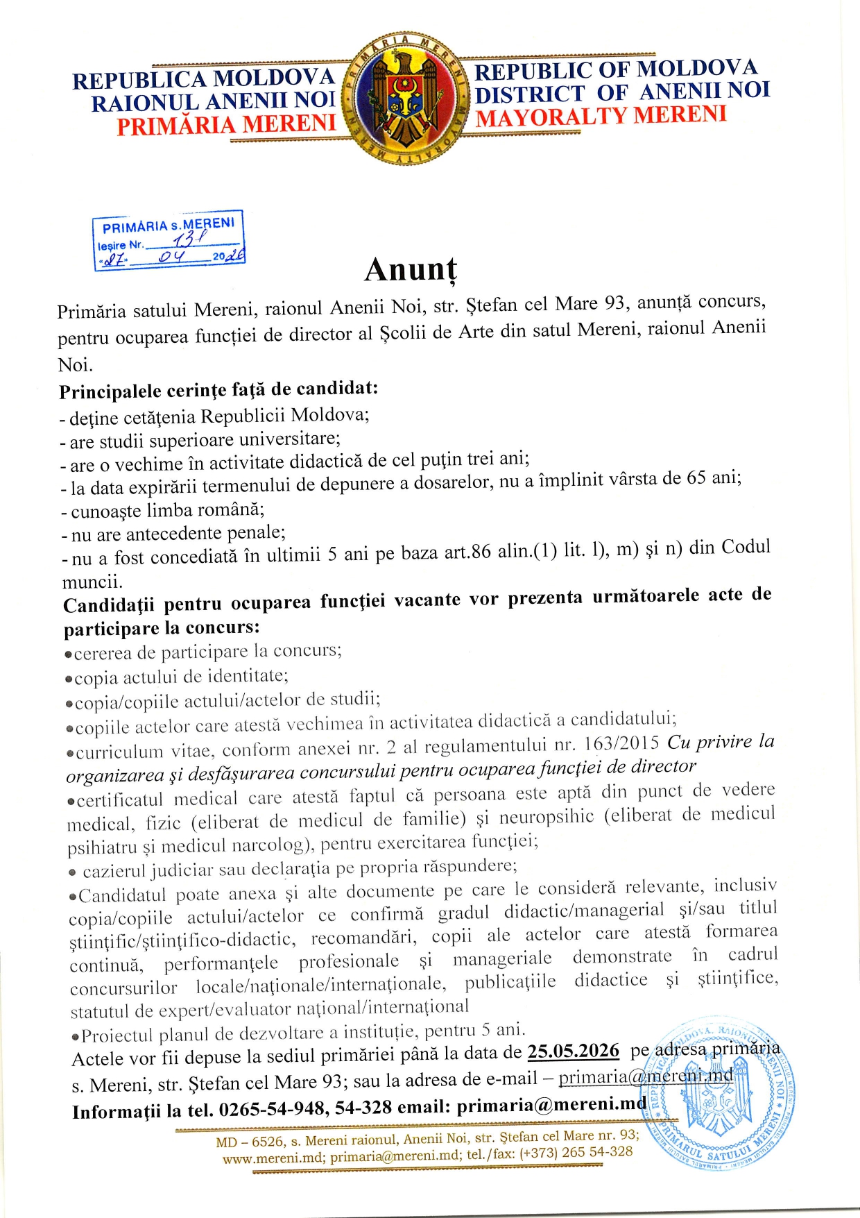 Adresa str. Ștefan cel Mare 96, s. Mereni, r. Anenii Noi, Republica Moldova