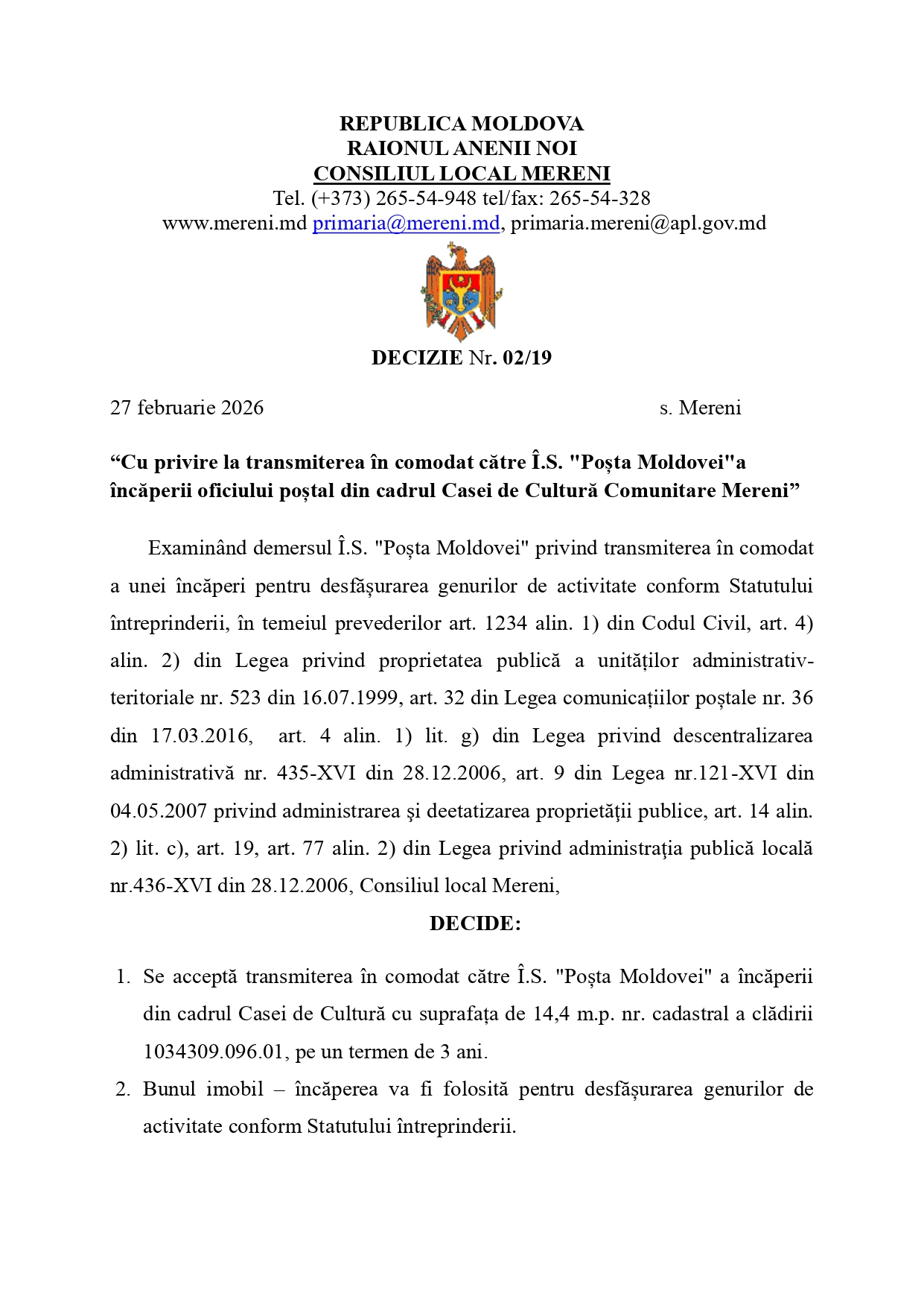 Deciziile Consiliului DECIZIE Nr. 02/19 27 februarie 2026 s. Mereni “Cu privire la transmiterea în comodat către Î.S. „Poșta Moldovei”a încăperii oficiului poștal din cadrul Casei de Cultură Comunitare Mereni” 9 aprilie 2026 Niciun comentariu