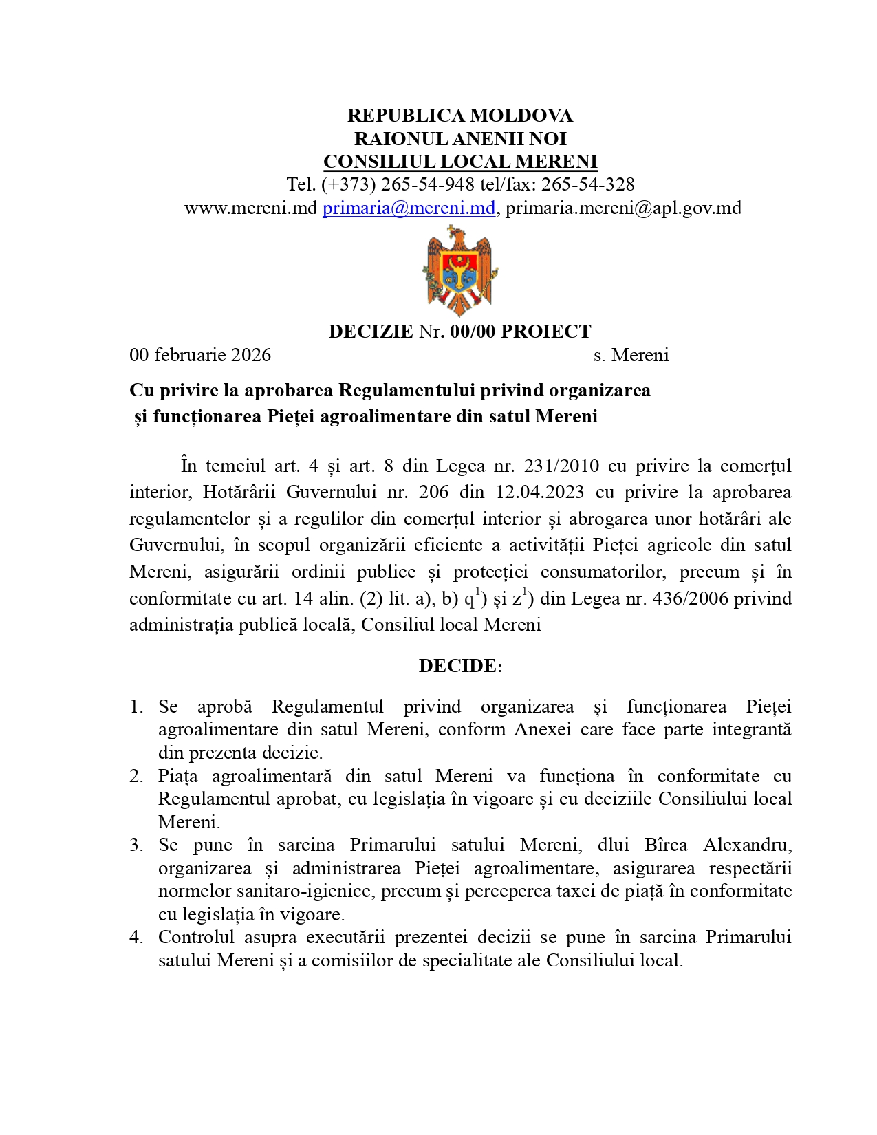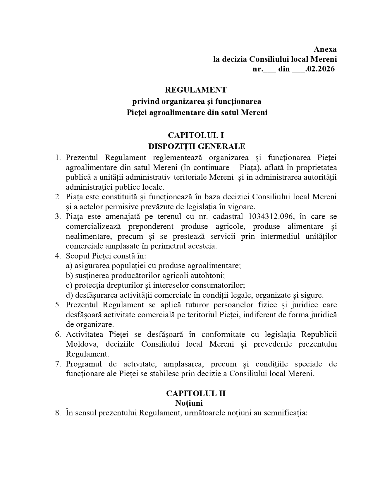 A N U N Ț cu privire la consultarea publică ”Cu privire la aprobarea Regulamentului privind organizarea și funcționarea Pieței agroalimentare din satul Mereni