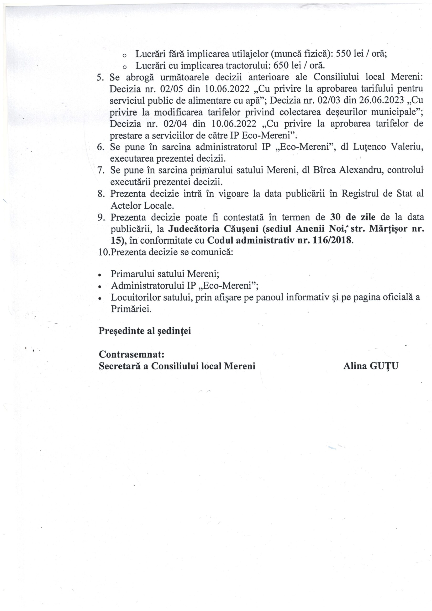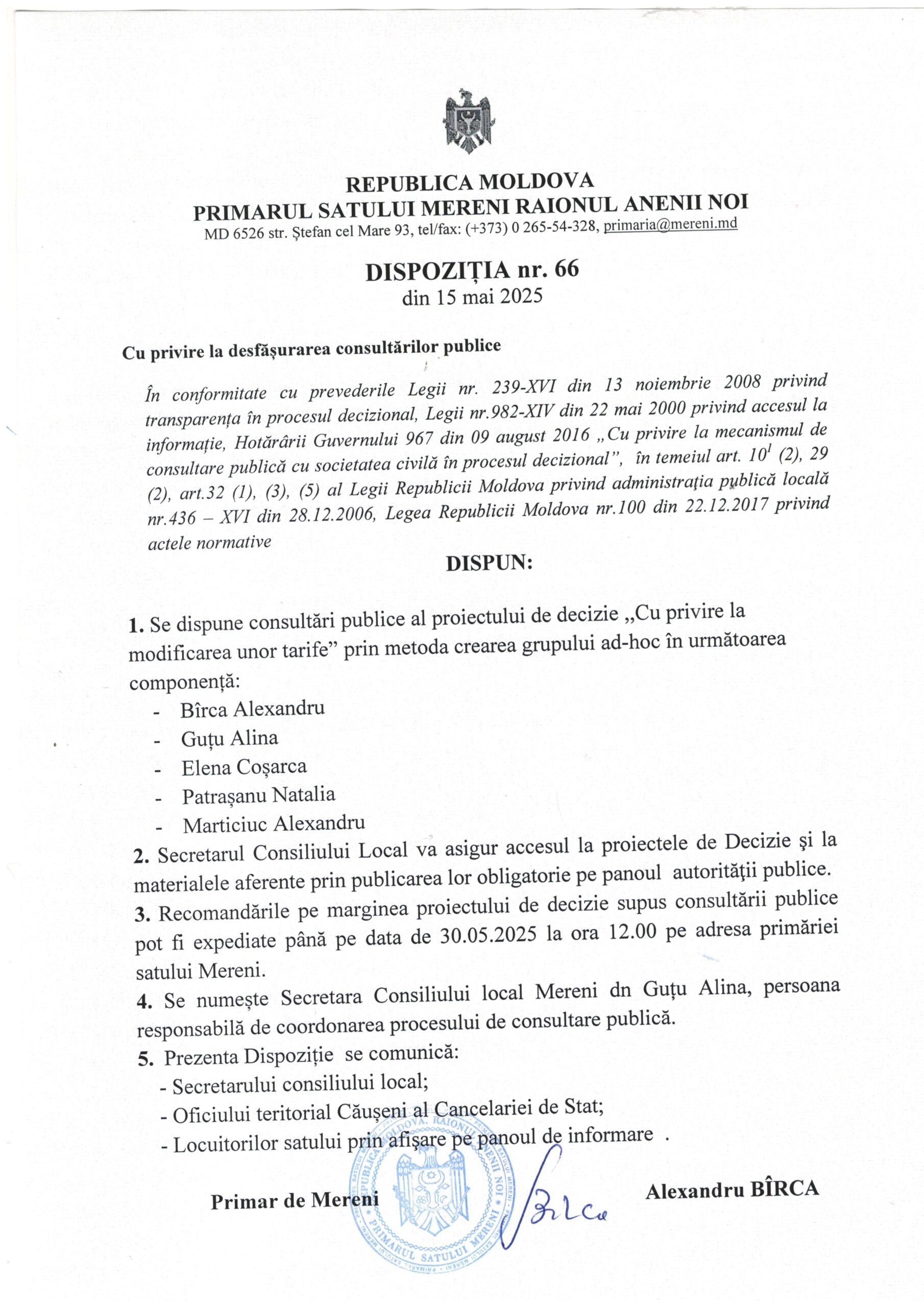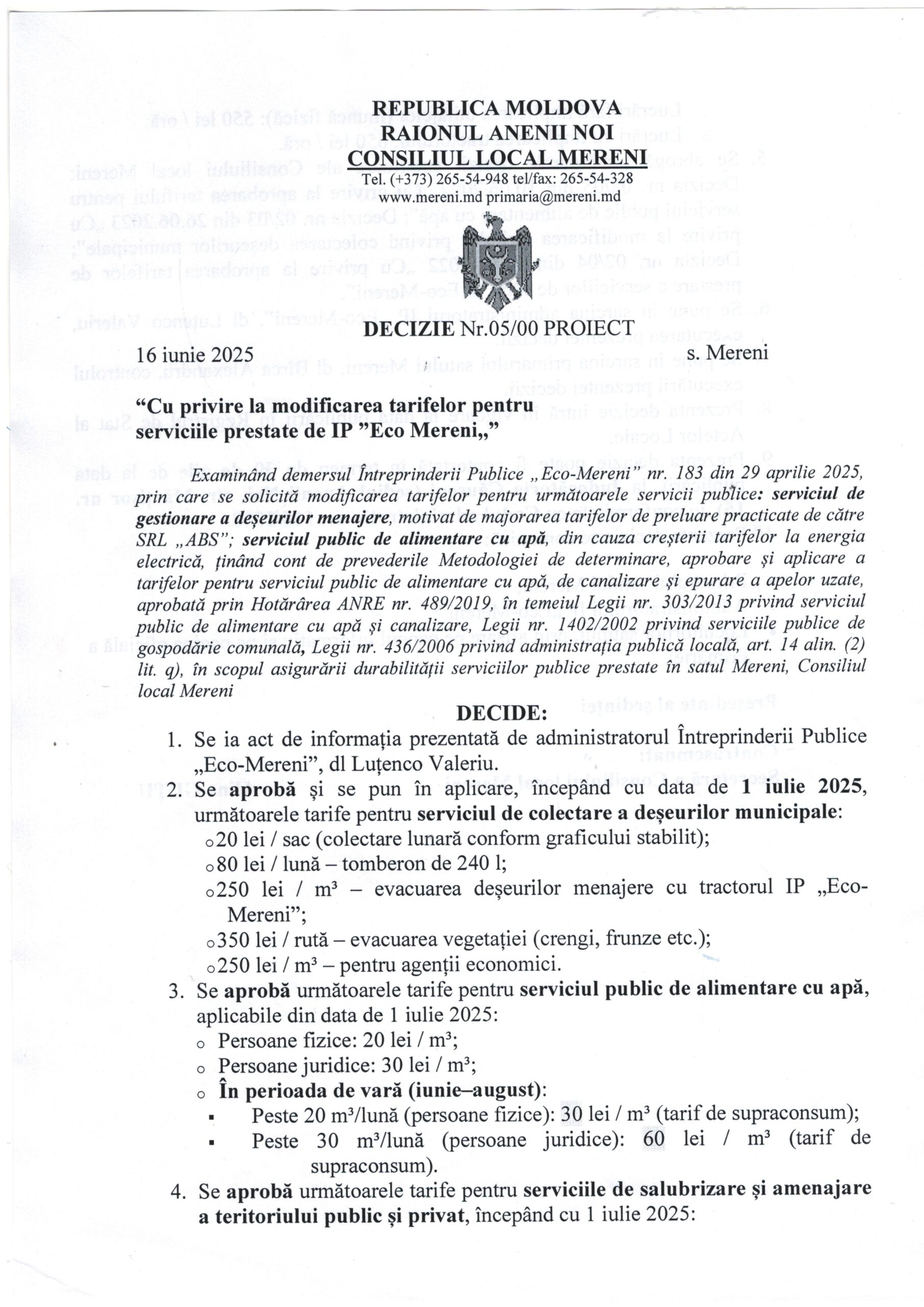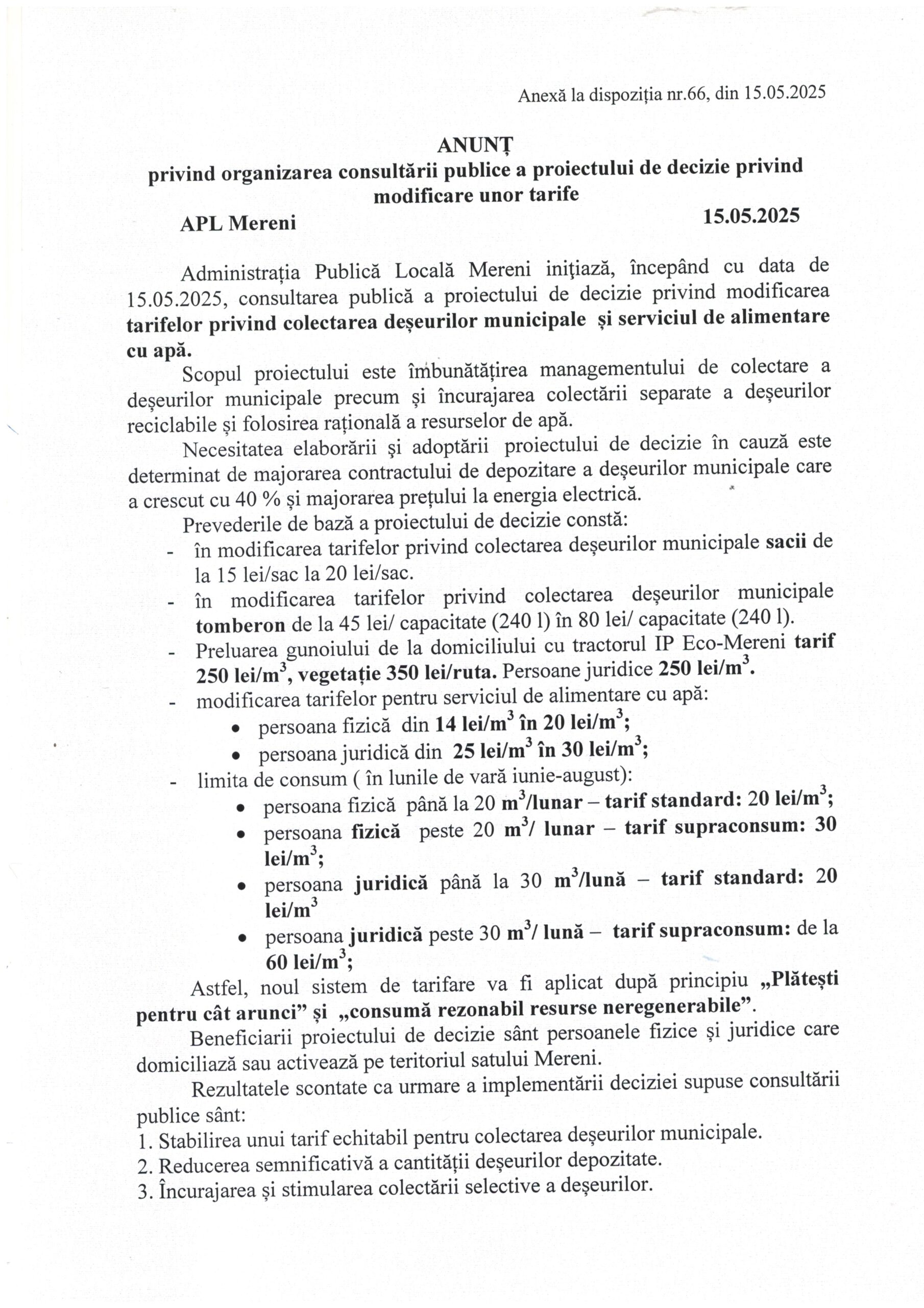 Anunț Consultări Publice ”Cu privire la modificarea tarifelor pentru serviciile prestate de IP ”Eco Mereni”