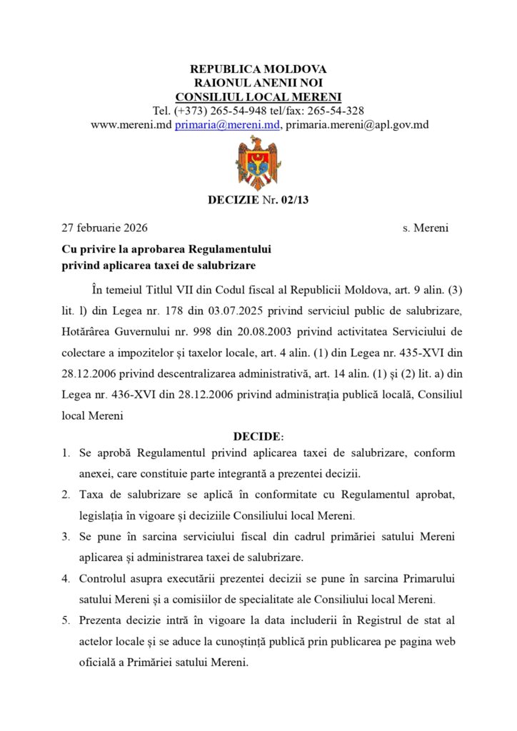 Deciziile ConsiliuluiDECIZIE Nr. 02/13 27 februarie 2026 s. Mereni Cu privire la aprobarea Regulamentului privind aplicarea taxei de salubrizare mereni / 9 aprilie 2026