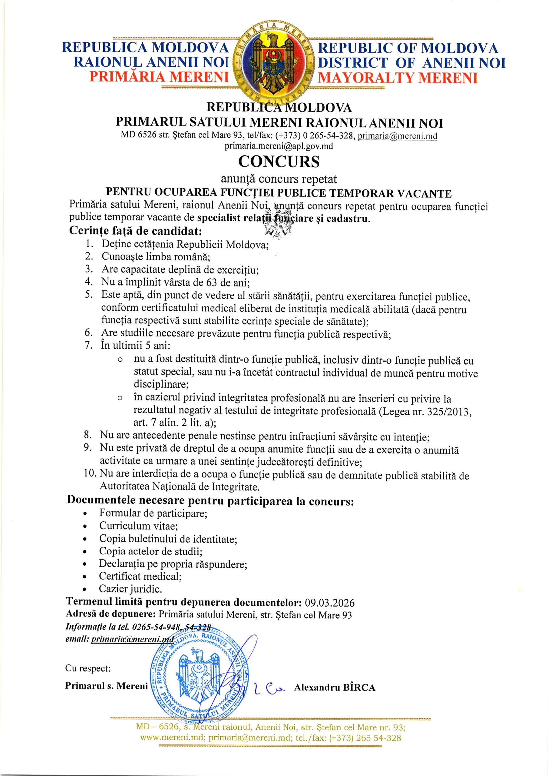 CONCURS REPETAT PENTRU OCUPAREA FUNCŢIEI PUBLICE VACANTE, Primăria satului Mereni, raionul Anenii Noi, anunță concurs repetat pentru ocuparea funcției publice temporar vacante de specialist relații funciare și cadastru.