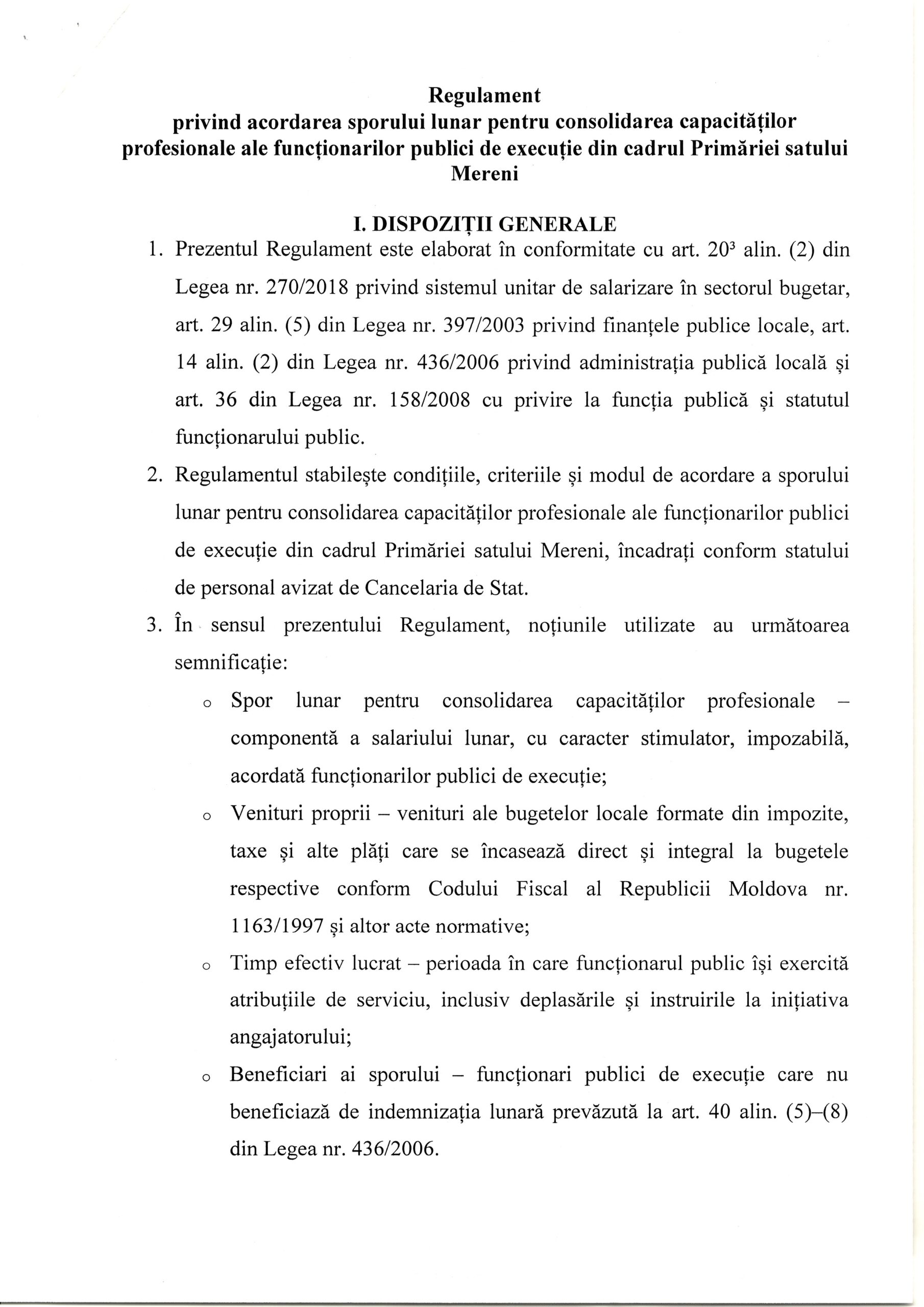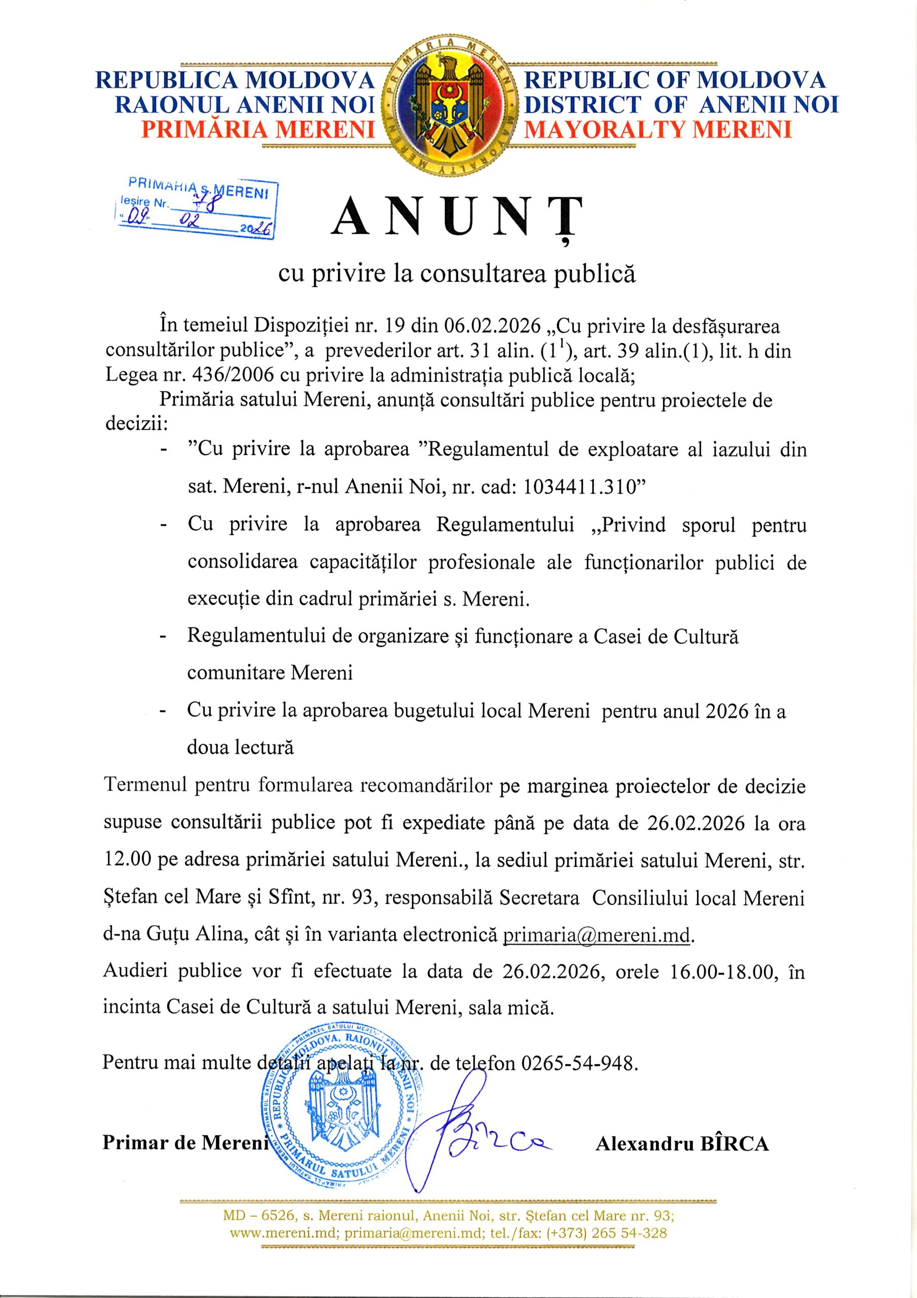 Consultare publică conform Dispoziției nr. 19 din 06.02.2026 Cu privire la aprobarea Regulamentului ,,Privind sporul pentru consolidarea capacităților profesionale ale funcționarilor publici de execuție din cadrul primăriei s. Mereni.