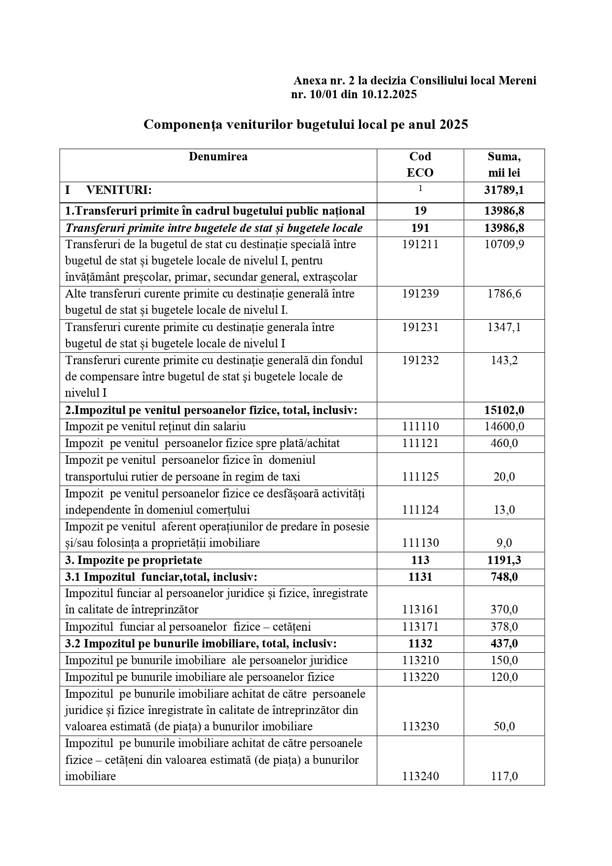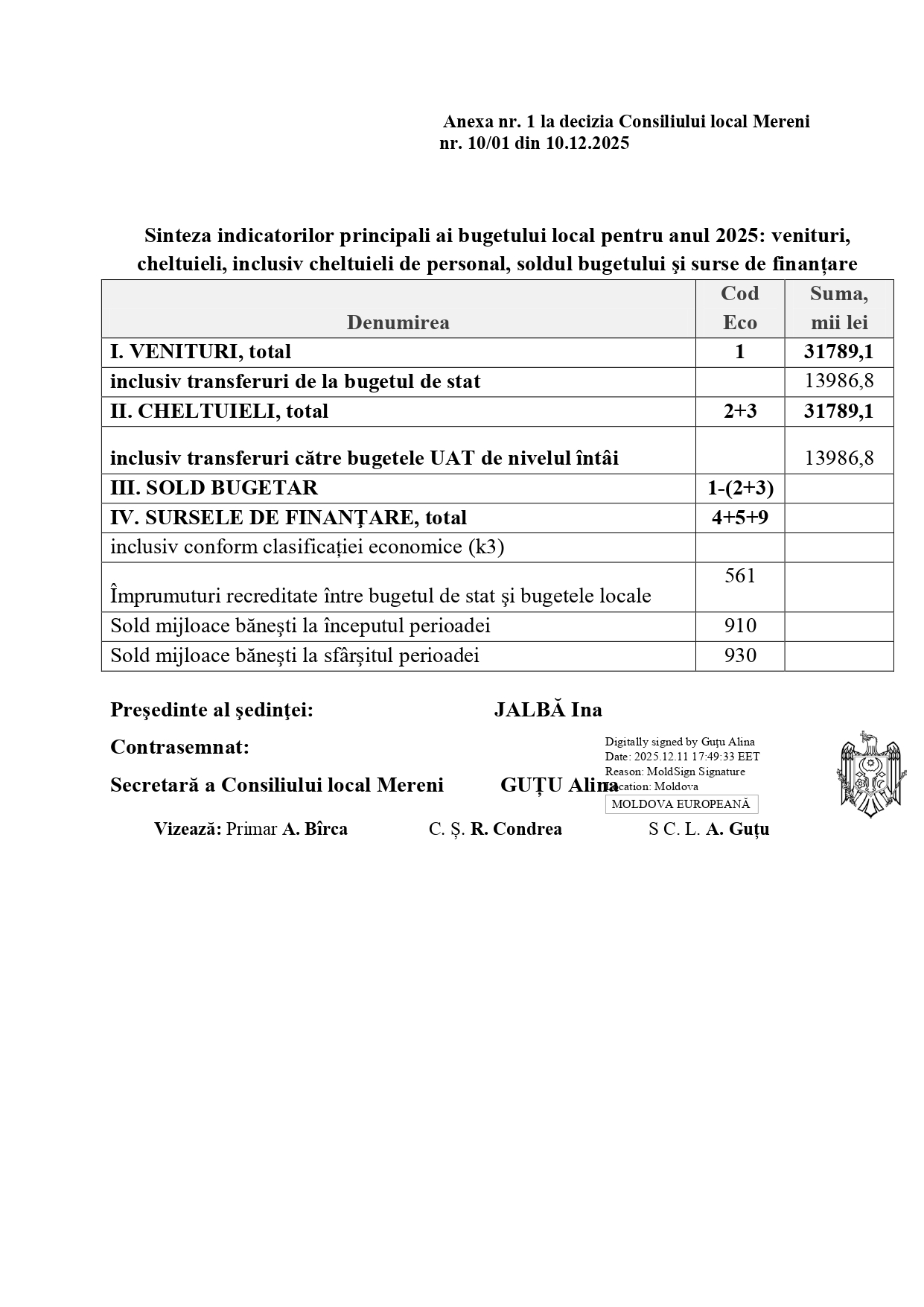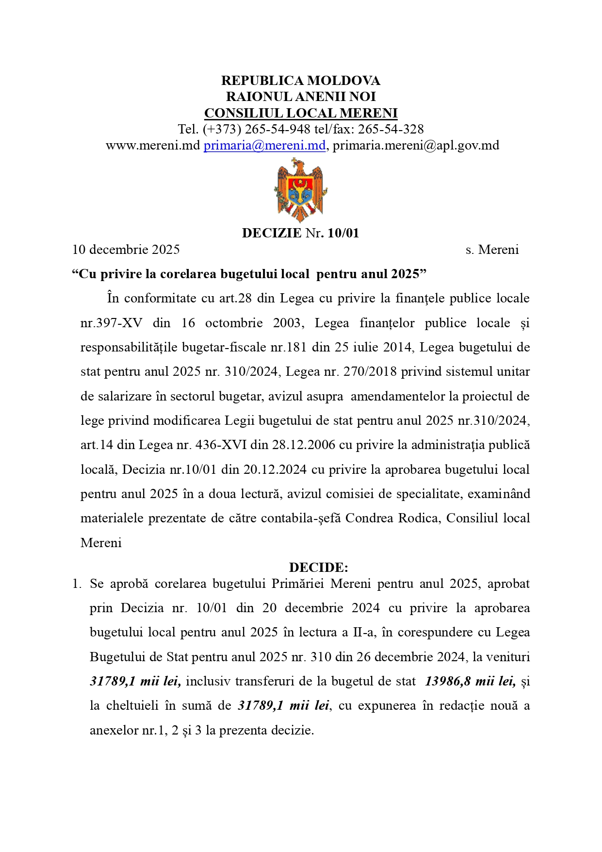 Decizia nr. 10/01 din 10.12.2025 Cu privire la corelarea bugetului local pentru anul 2025