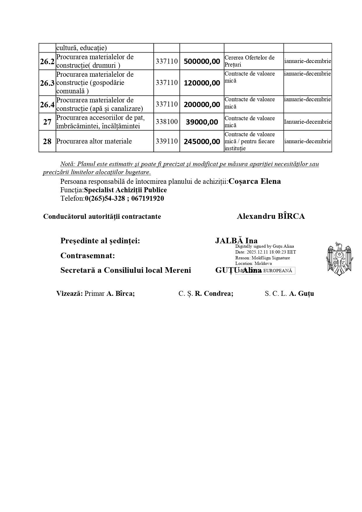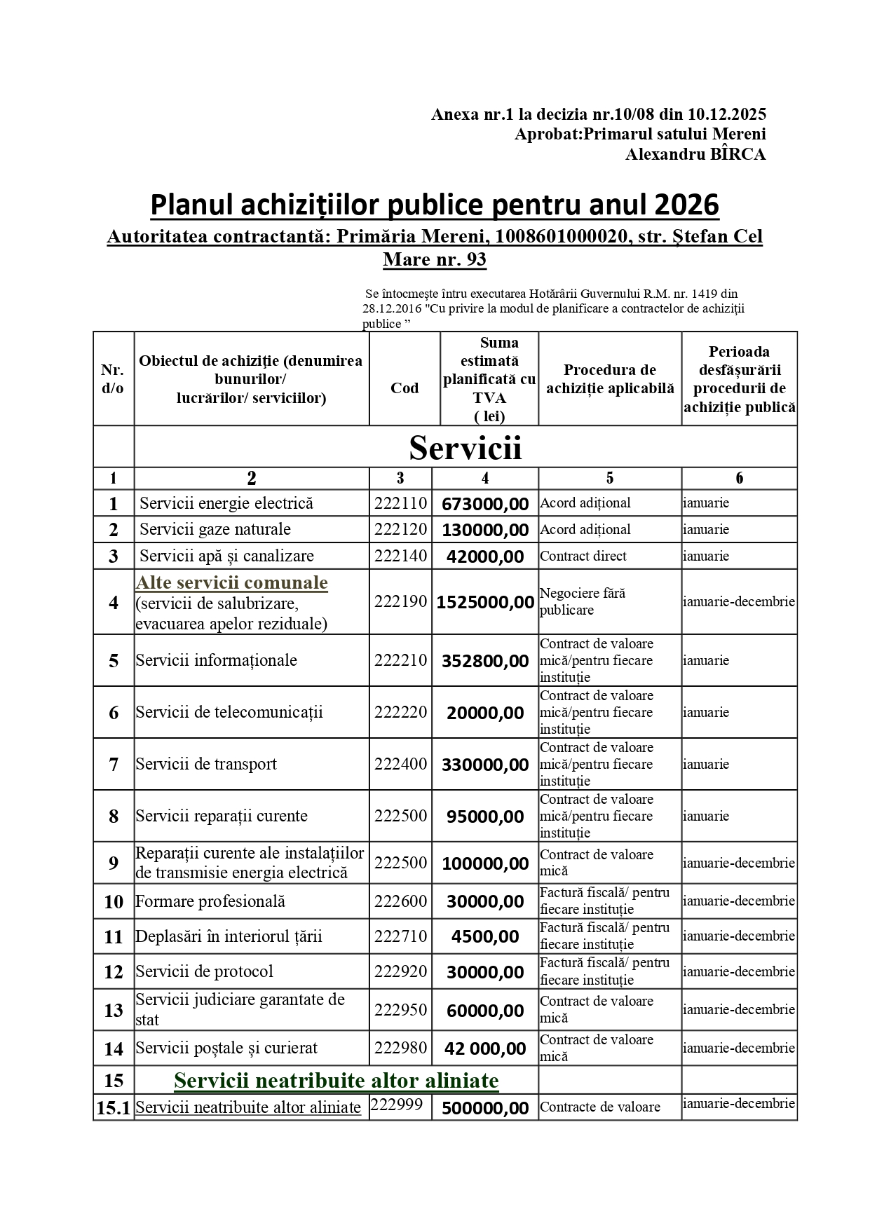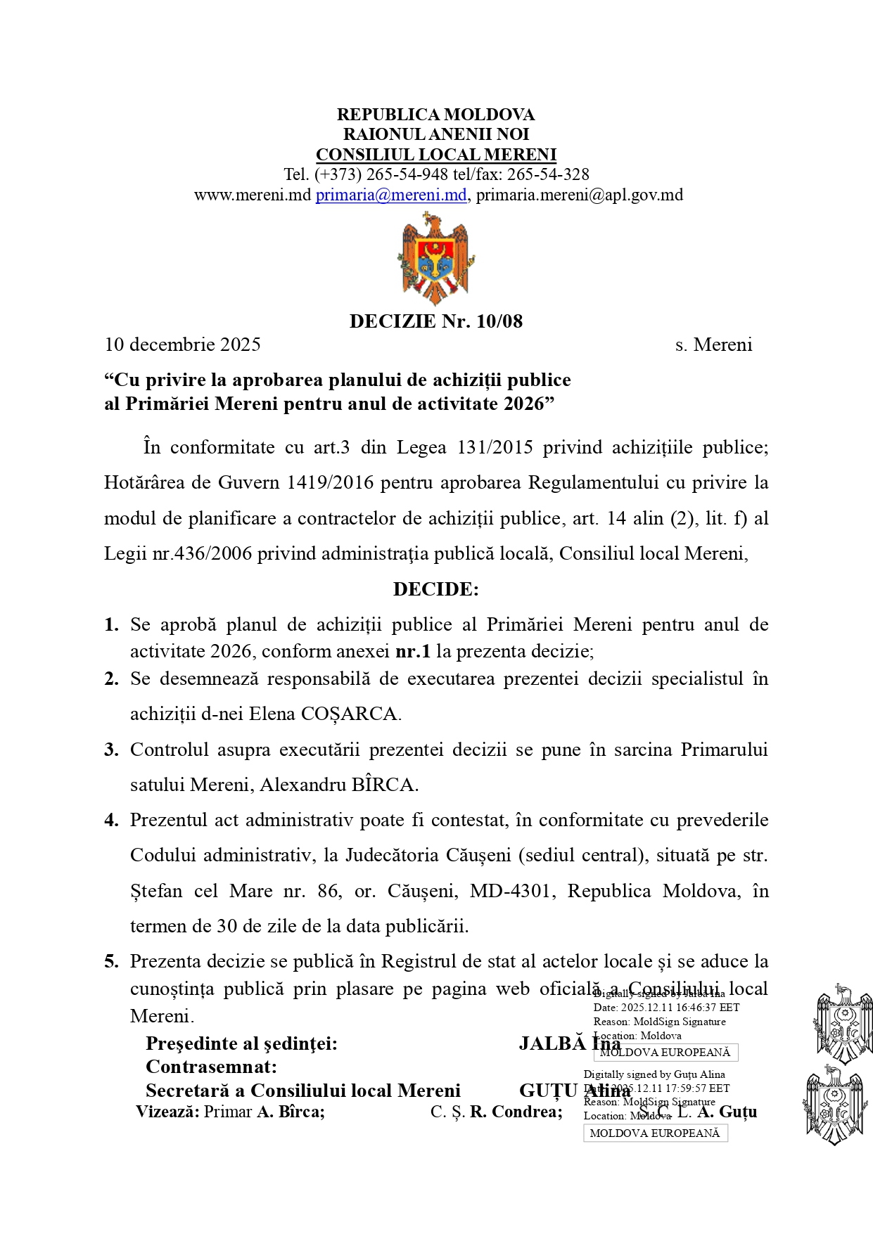 Deciza nr. 10/08 din 10.12.2025 Cu privire la aprobarea planului de achiziții publice al Primăriei Mereni pentru anul de activitate 2026