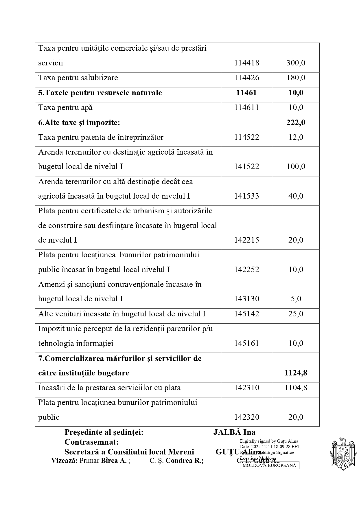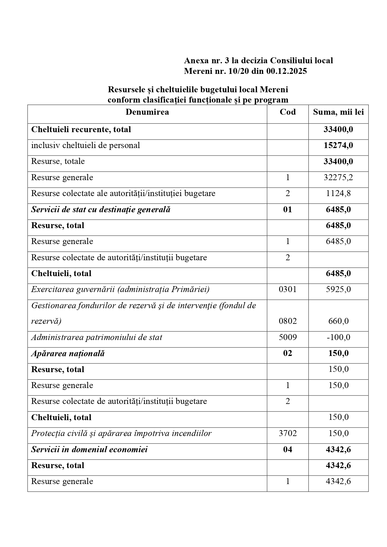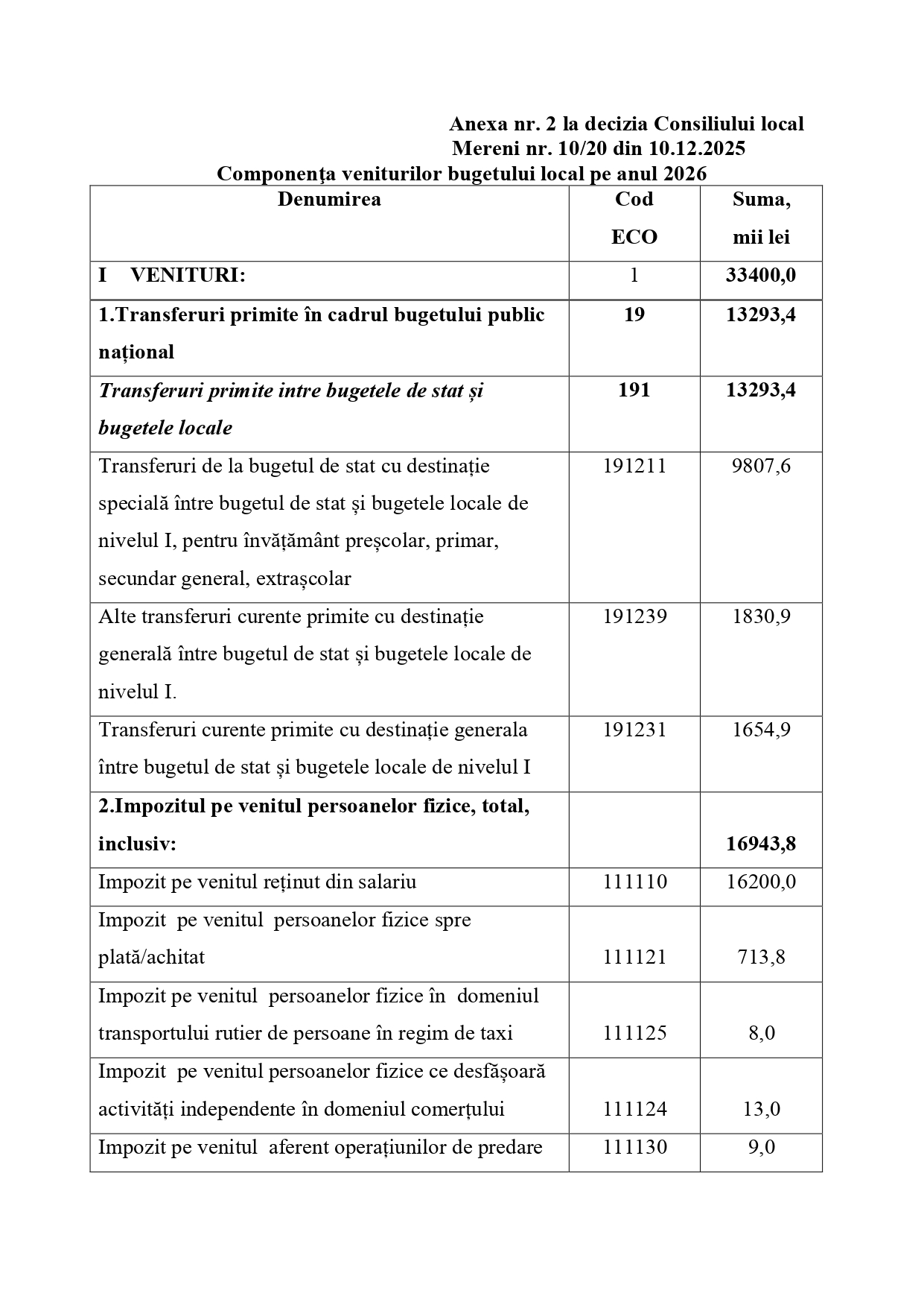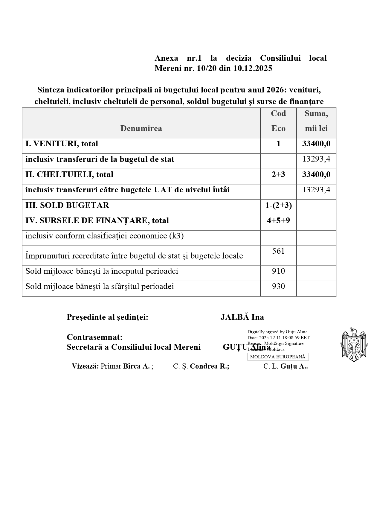 Decizia nr. 10/20 din 10.12.2025 Cu privire la aprobarea bugetului local Mereni pentru anul 2026 în a doua lectură