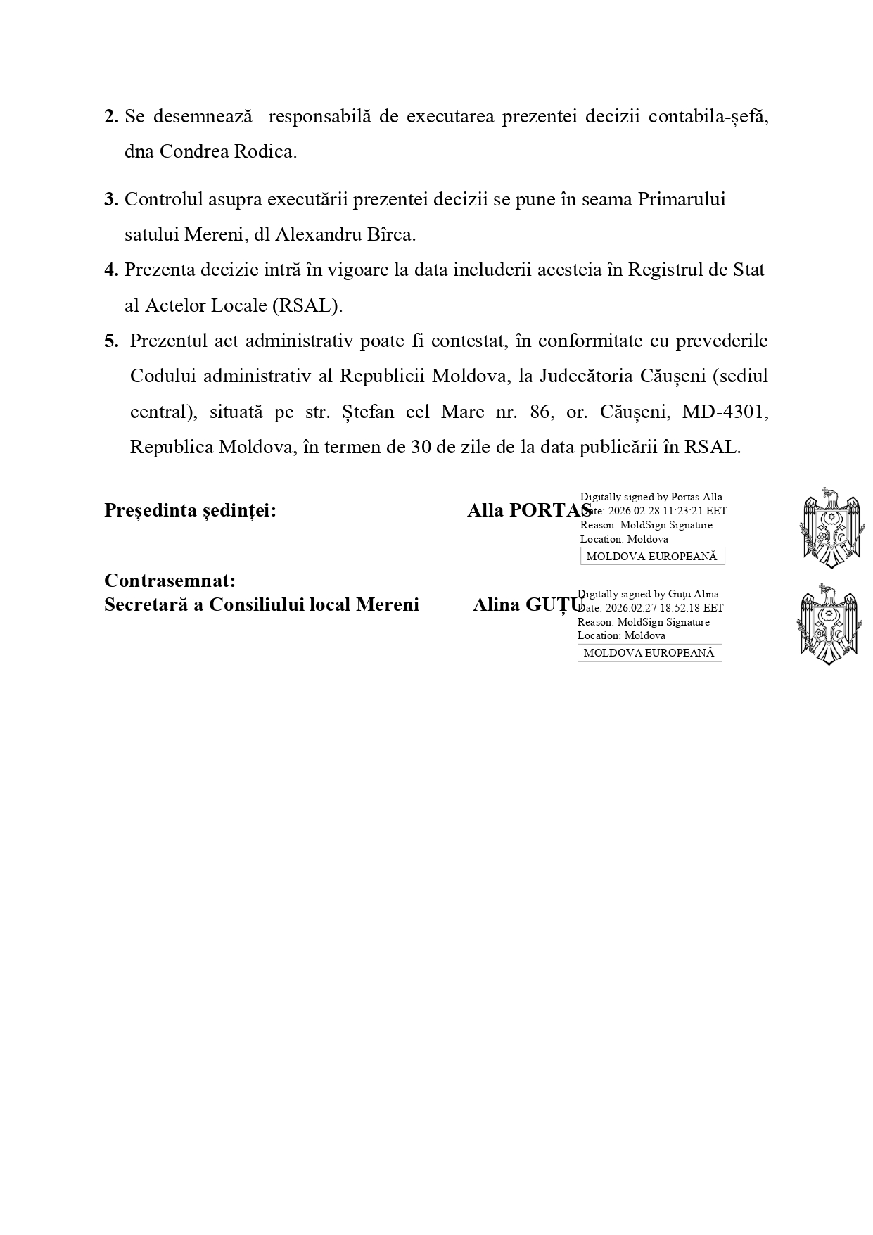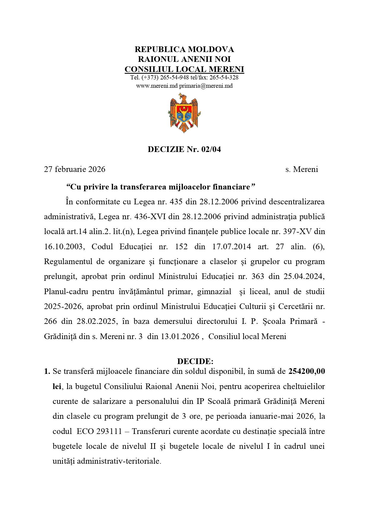 DECIZIE Nr. 02/04 27 februarie 2026 s. Mereni “Cu privire la transferarea mijloacelor financiare”