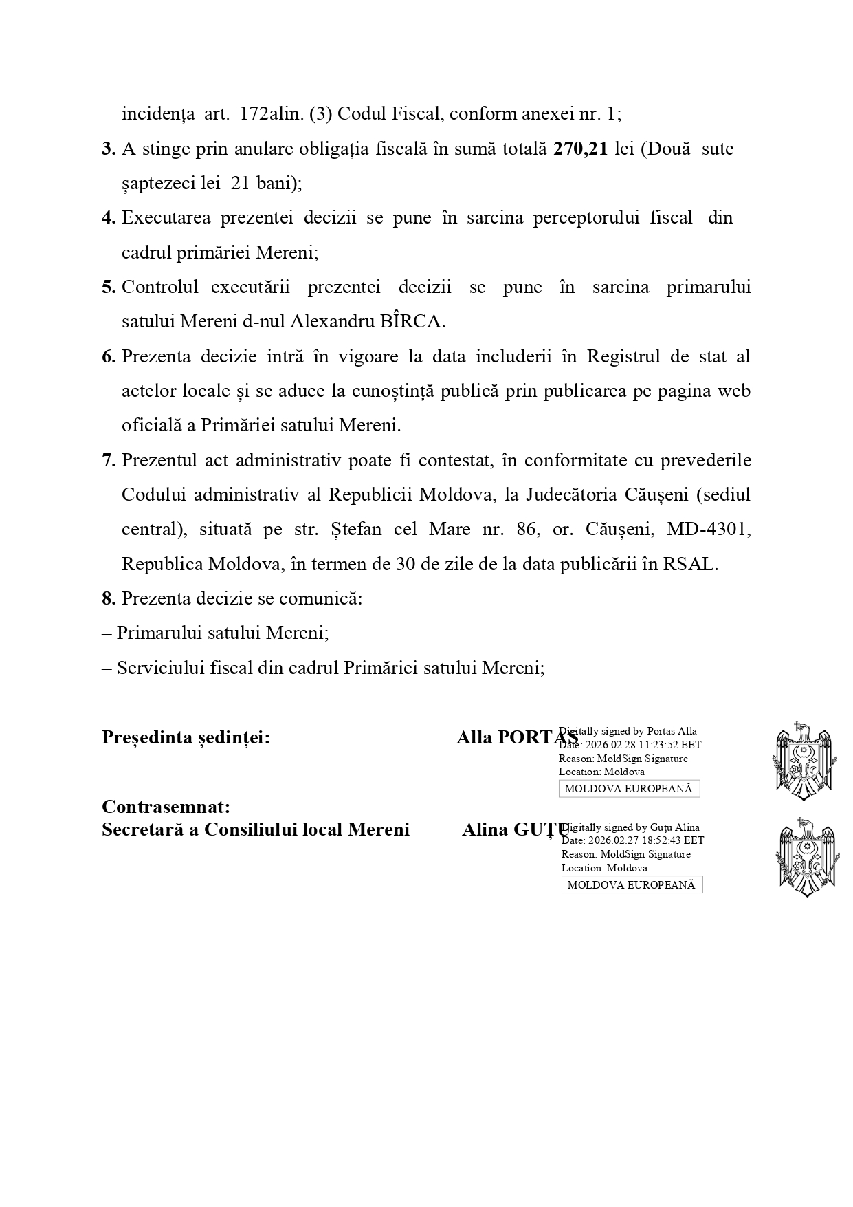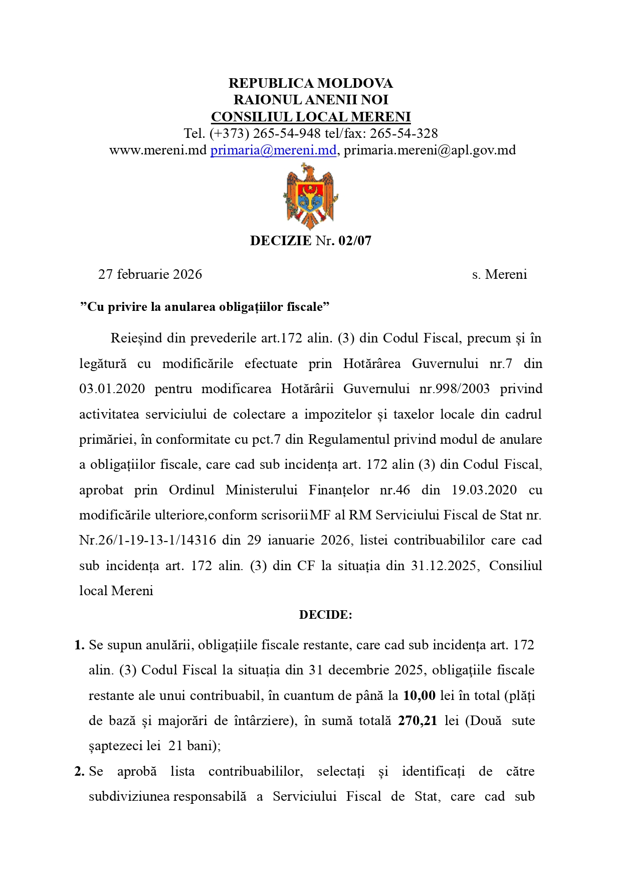 DECIZIE Nr. 02/07 27 februarie 2026 s. Mereni ”Cu privire la anularea obligațiilor fiscale”