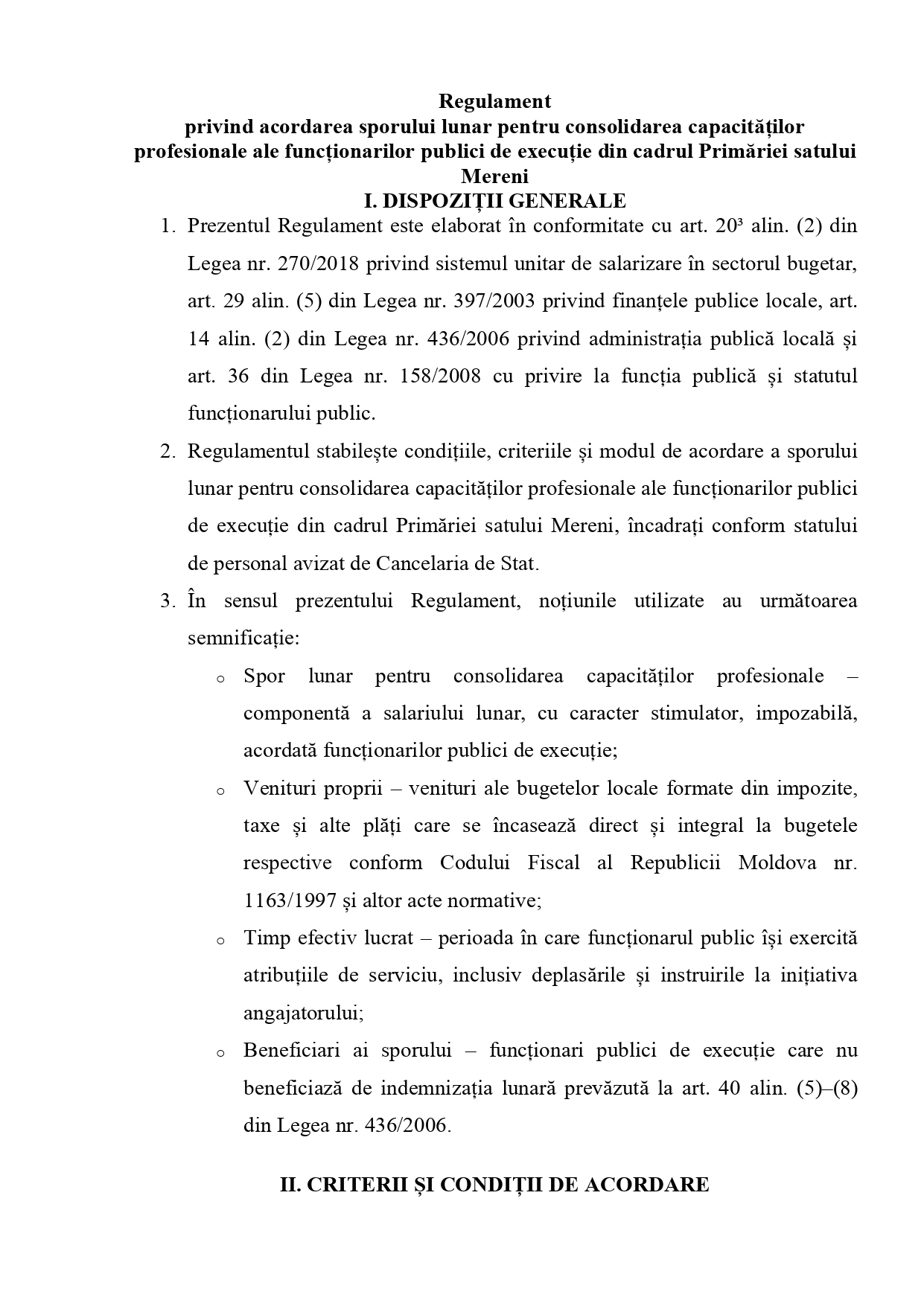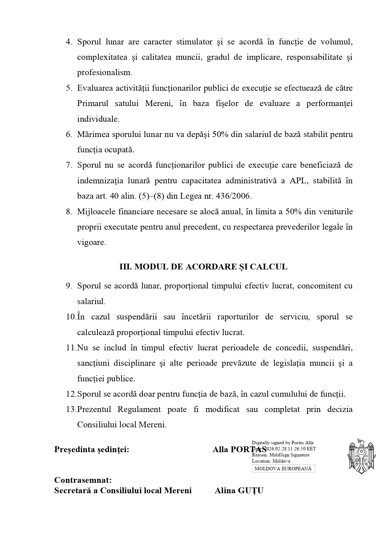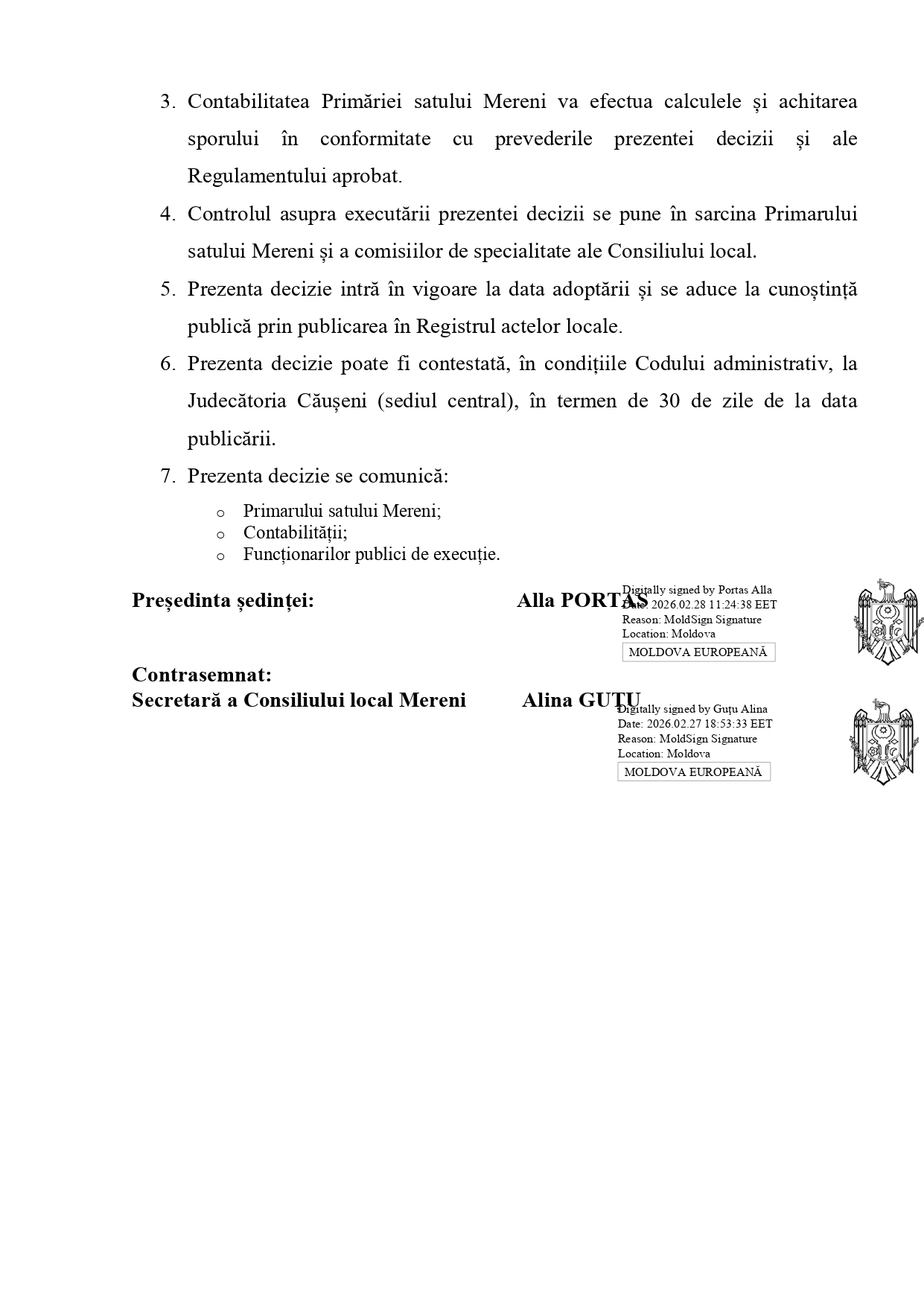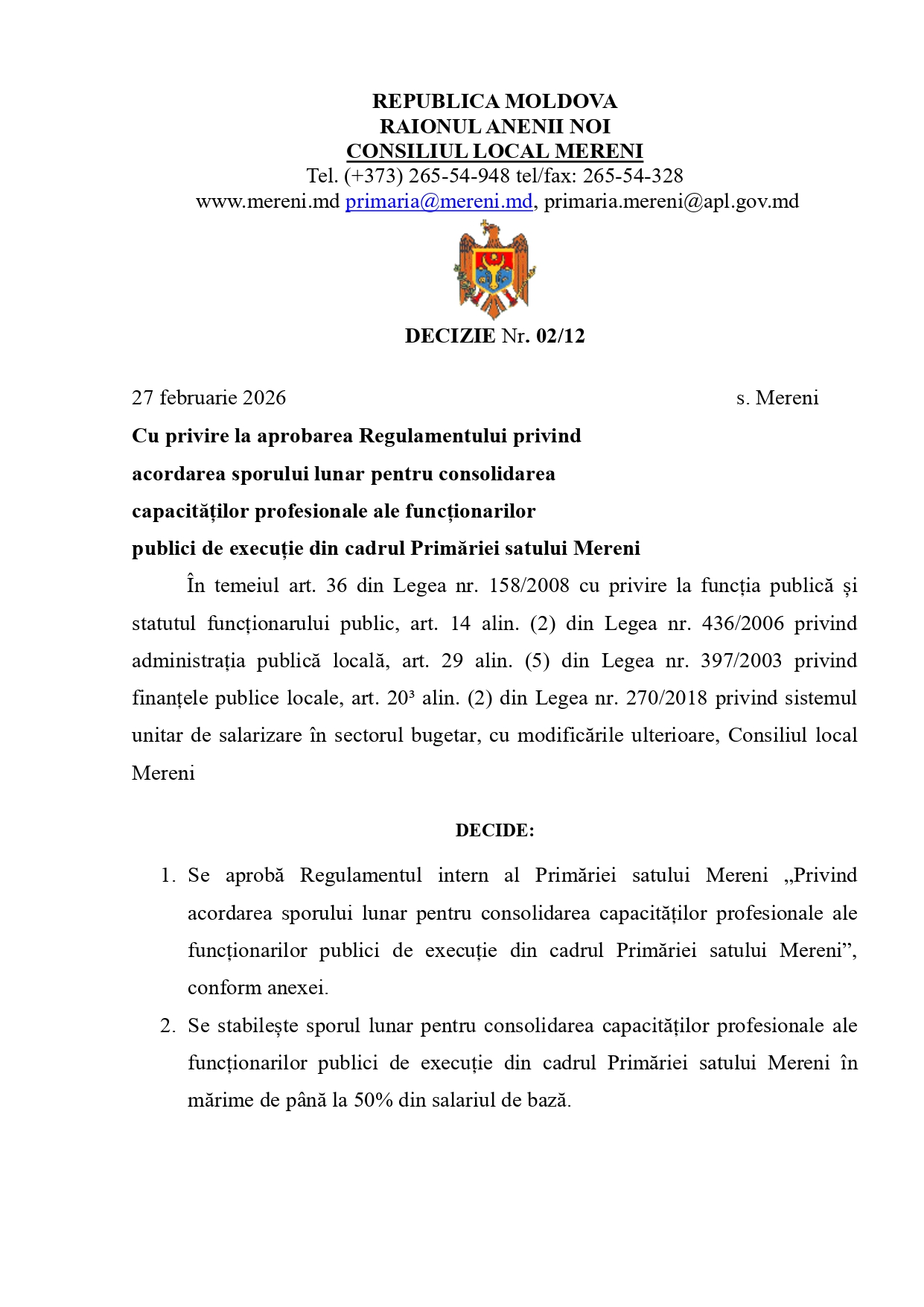 DECIZIE Nr. 02/12 27 februarie 2026 s. Mereni Cu privire la aprobarea Regulamentului privind acordarea sporului lunar pentru consolidarea capacităților profesionale ale funcționarilor publici de execuție din cadrul Primăriei satului Mereni