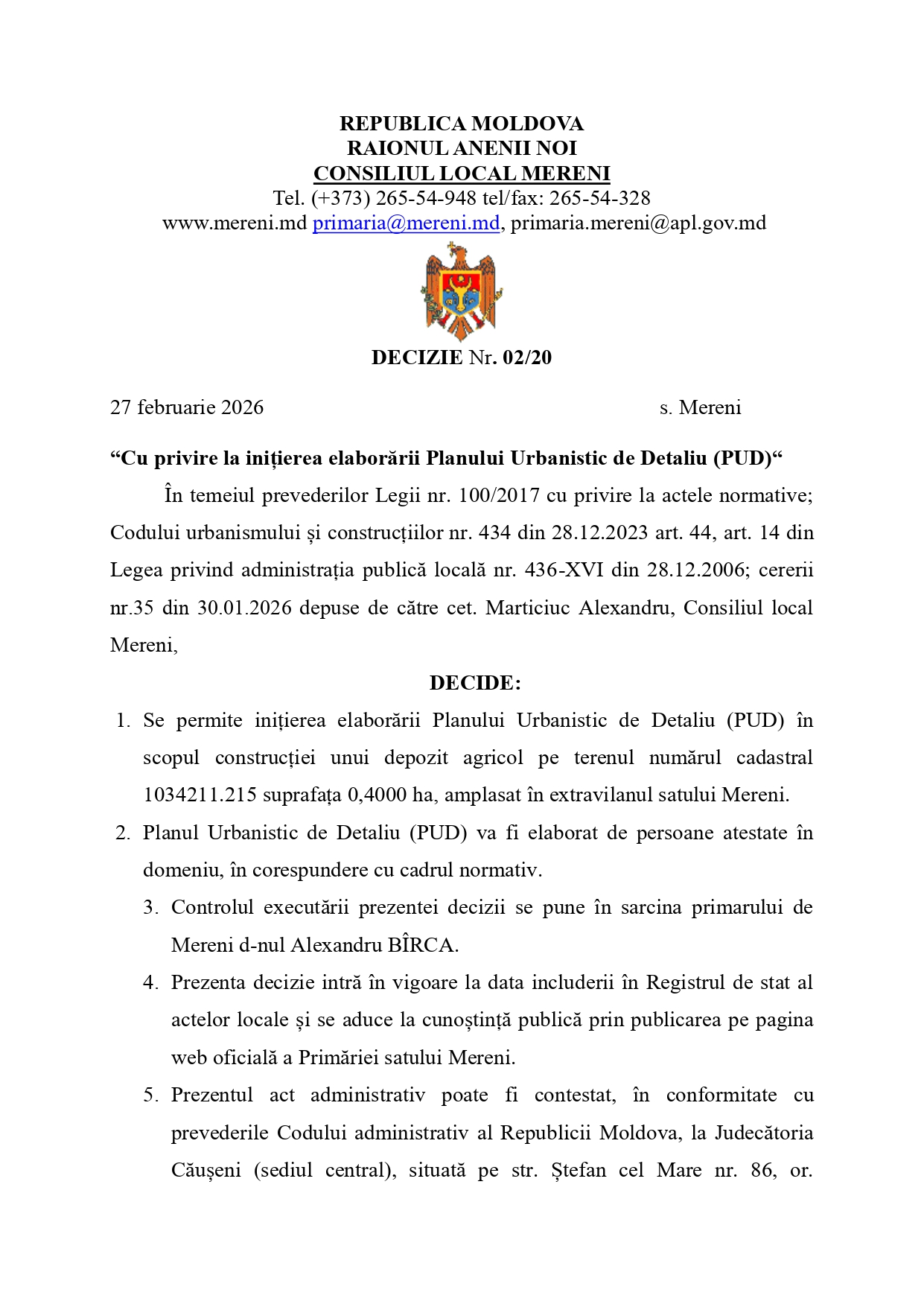 DECIZIE Nr. 02/20 27 februarie 2026 s. Mereni “Cu privire la inițierea elaborării Planului Urbanistic de Detaliu (PUD)“